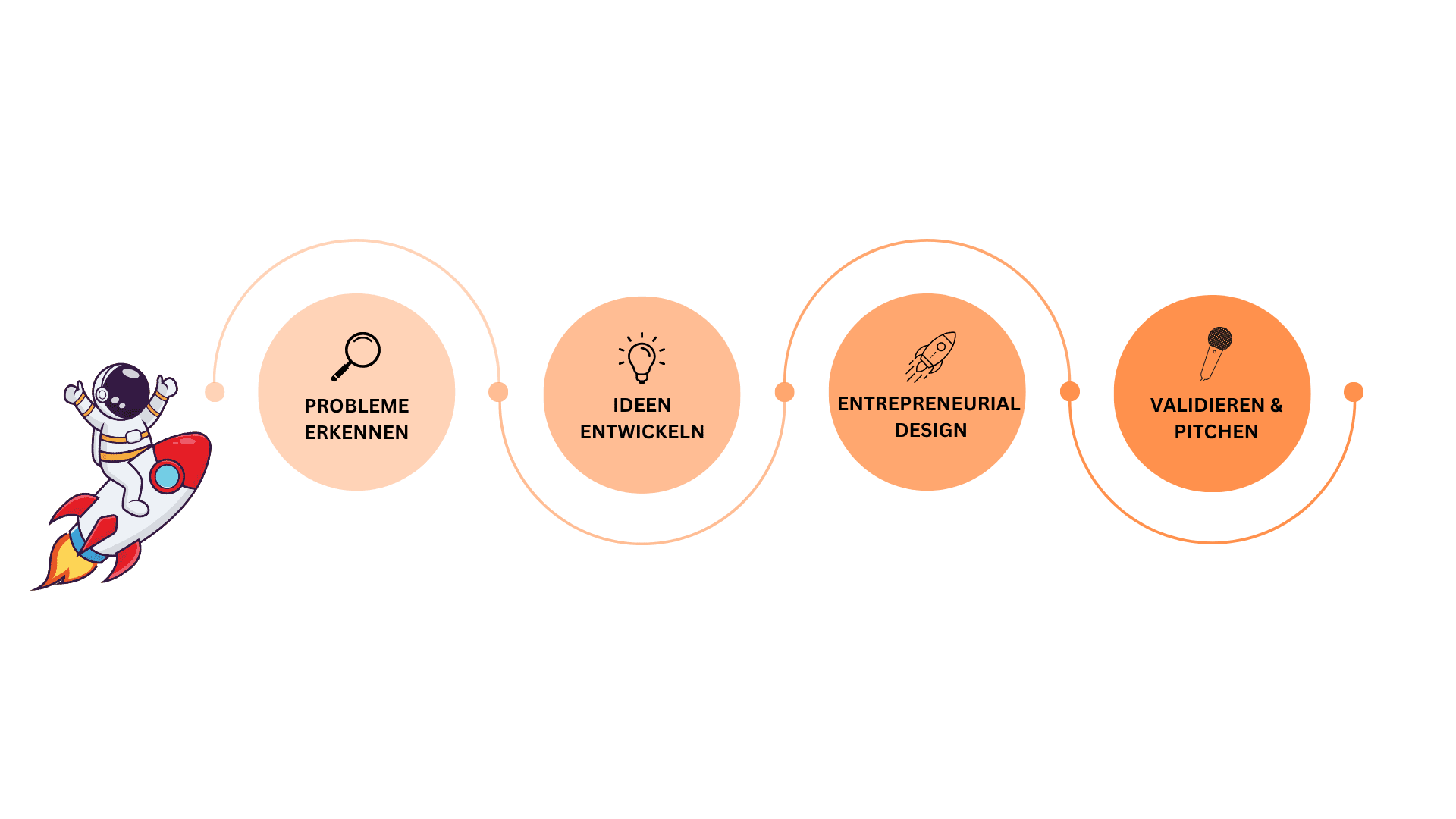 Angeleitet werden sie dabei von zwei eingeschulten Trainer/-innen. Sie lernen, wie sie Chance erkennen und mit eigenen Ideen bearbeiten können. Sie erarbeiten ein erstes Konzept für ihre Idee und lernen, andere von ihrer Idee zu überzeugen. Unterstützung bekommen sie dabei von Sparringspartner/-innen aus dem Ökosystem.