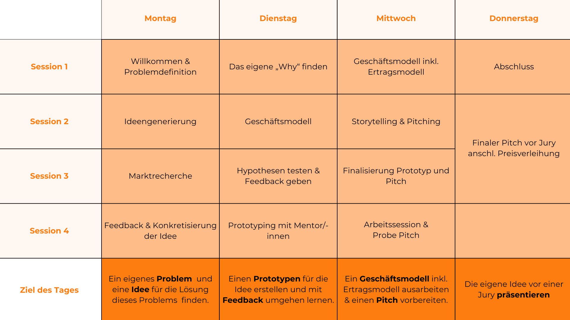 Geleitet wird jede Youth Entrepreneurship Week von zwei erfahrenen Trainer/innen oder einer Trainer/in und einer Lehrperson als Co-Trainer/in. Die jeweilige Youth Entrepreneurship Week wird in enger Abstimmung mit der Bildungsorganisation geplant und findet, wenn möglich, bei einem inspirierenden Host in der Umgebung statt. Die Inhalte der Entrepreneurship Week können nahtlos mit dem Unterricht verknüpft werden und decken Themen des Lehrplans ab. Das Angebot ist für die Jugendlichen kostenfrei.